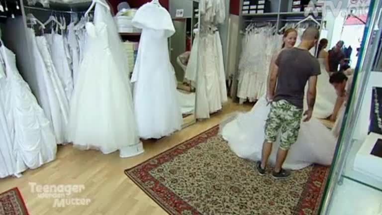 Nachdem Patrick mit der Absage der Hochzeit gedroht hatte, falls ihm das Brautkleid nicht gefällt, darf er mit ins Brautmodengeschäft, um Elli bei der Auswahl zu unterstützen.