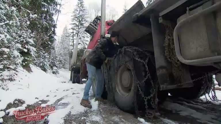 Der Winter ist ins Land gezogen - im Wald herrschen winterliche Straßenverhältnisse und Doris muss die Schneeketten aufziehen. Keine leichte Aufgabe - die Ketten sind schwer und die Kleidung schnell dreckig.